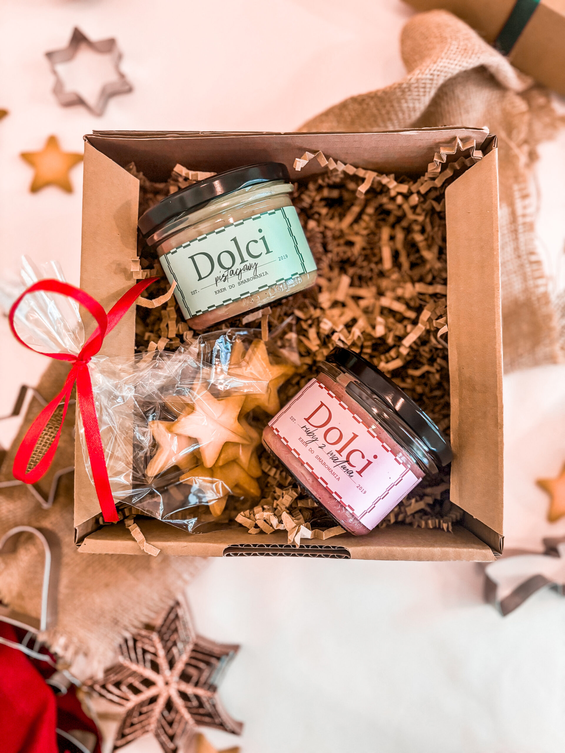 Boxy prezentowe to nowa forma klasycznych koszy (te już troszkę się przejadły), które zawsze robią wrażenie. Zamiast stawiać na standardowe wina i kawy, pomyśl o czymś bardziej „wow”. Wyobraź sobie elegancki kosz pełen słodkich kremów o smakach niedostępnych w sklepie – pistacjowy, biały Michałek, a może ruby z maliną liofilizowaną? Do tego ręcznie robione maślane ciasteczka, które rozpływają się w ustach. Zapakowane z klasą, a jednocześnie z sercem – idealne, żeby zaskoczyć klientów i partnerów.