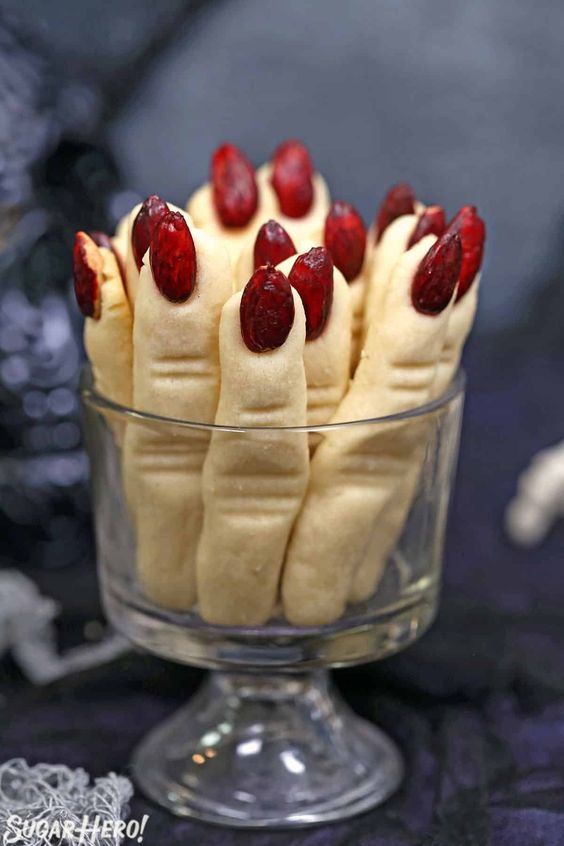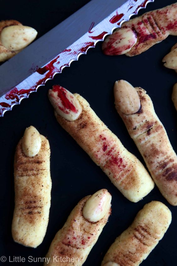 Przerażające ciasteczka w kształcie palców? Proszę bardzo! Kruche ciasto, migdał jako paznokieć i trochę dżemu truskawkowego dla efektu krwi. Zaufaj mi, będą wyglądać jak prawdziwe… ale spokojnie, są przepyszne!