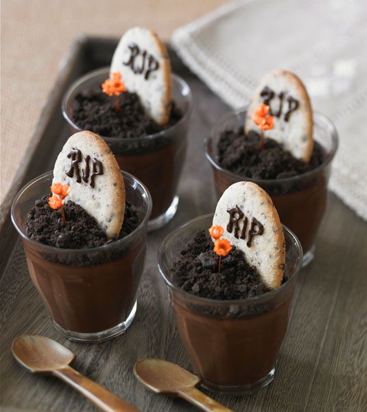 Masz ochotę na coś mega czekoladowego? Brownie z motywem grobu to hit każdej halloweenowej imprezy! Pokrój ciasto na kawałki, udekoruj napisami „R.I.P.” z czekolady i dodaj trochę pokruszonych herbatników jako „ziemię”. Proste, a jakie efektowne! Możesz także wyciąć brownie w kształt trumien lub włożyć ciastko z napisem RIP w babeczkę albo do słoiczka!