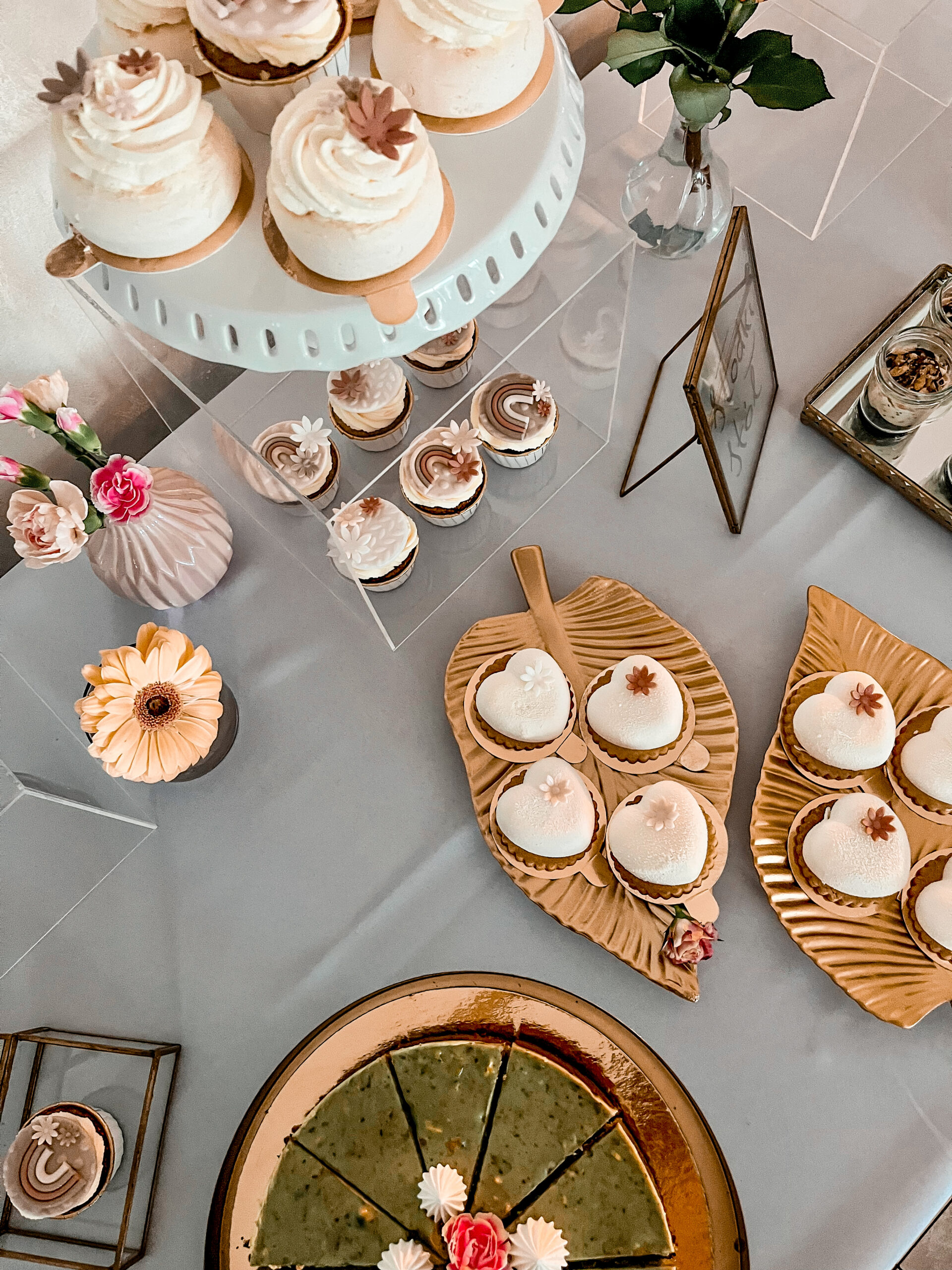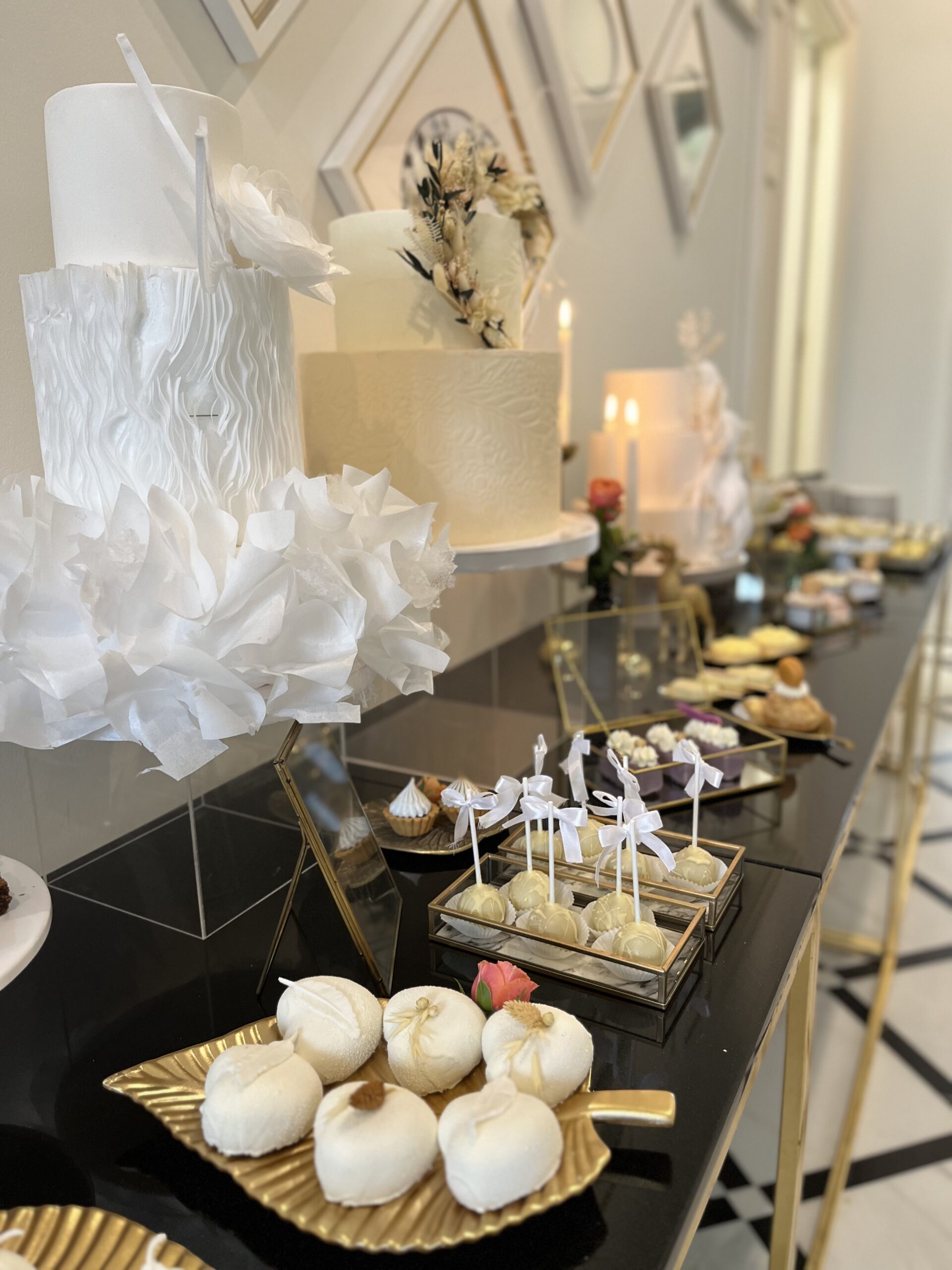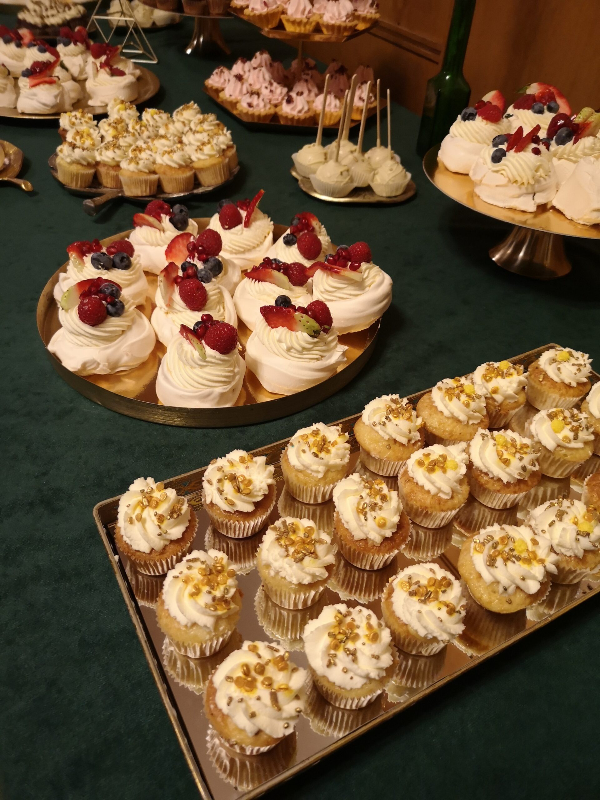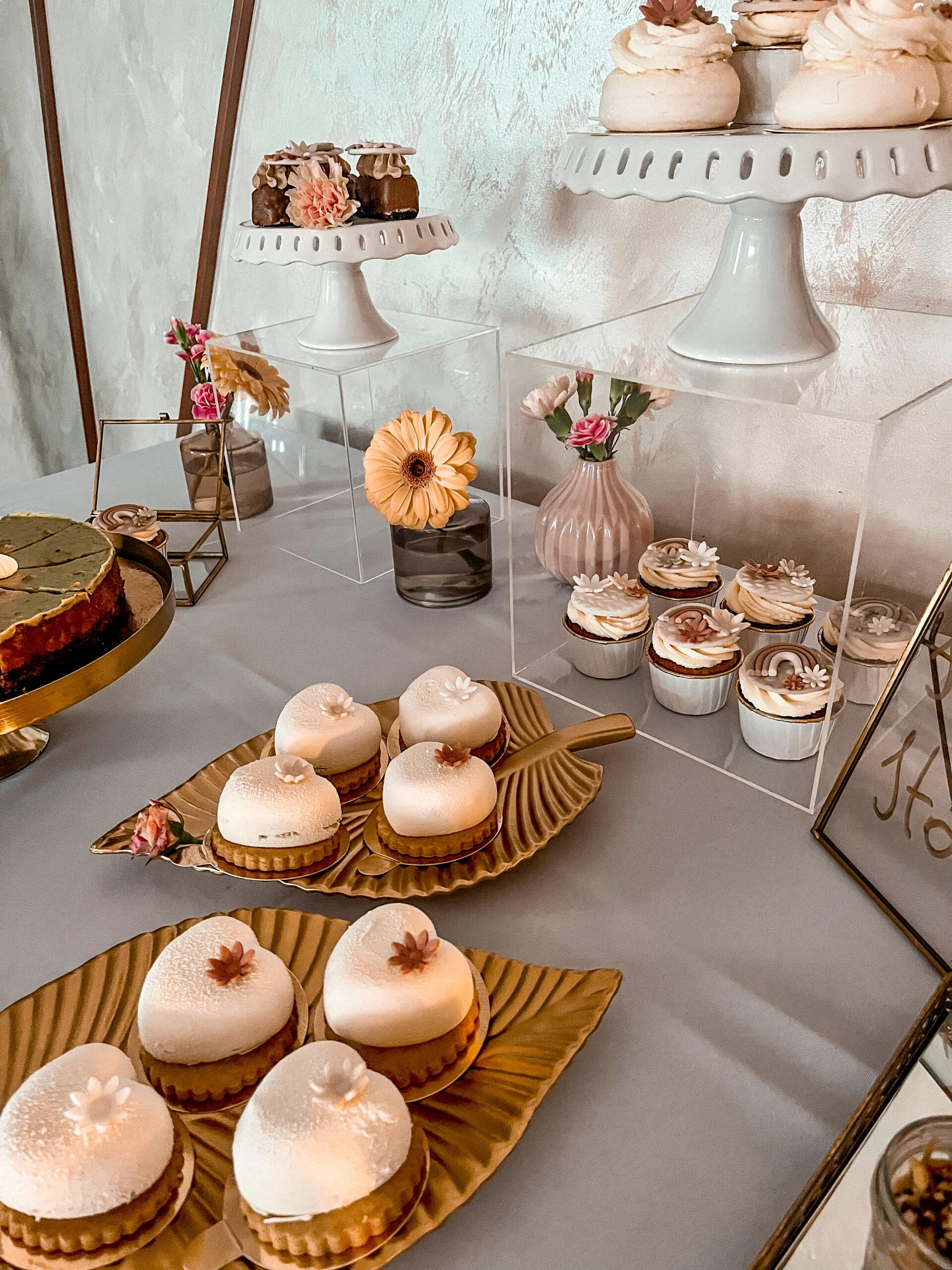 Dekoracje na stołach będą nawiązywać do wybranej palety kolorystycznej – jadalne kwiaty, delikatne złote akcenty oraz transparentne naczynia dodadzą całości lekkiego, ale eleganckiego charakteru. Dzięki temu każdy deser będzie wyglądał jak małe dzieło sztuki.