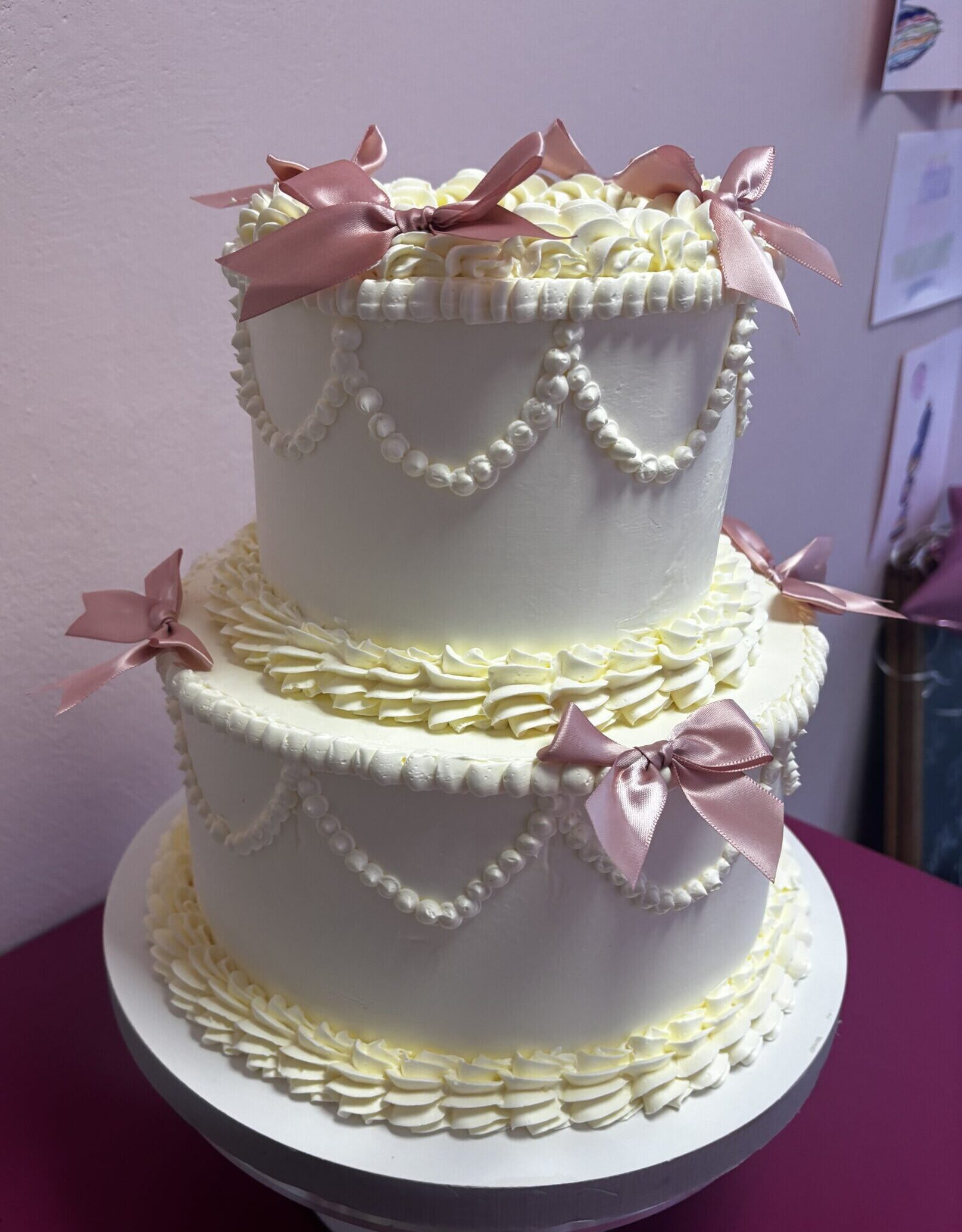 Dekoracja tortu Lambeth jest niemal identyczna, jak w tortach vintage, jednak kokardki nadają mu niepowtarzalnego uroku i elegancji.